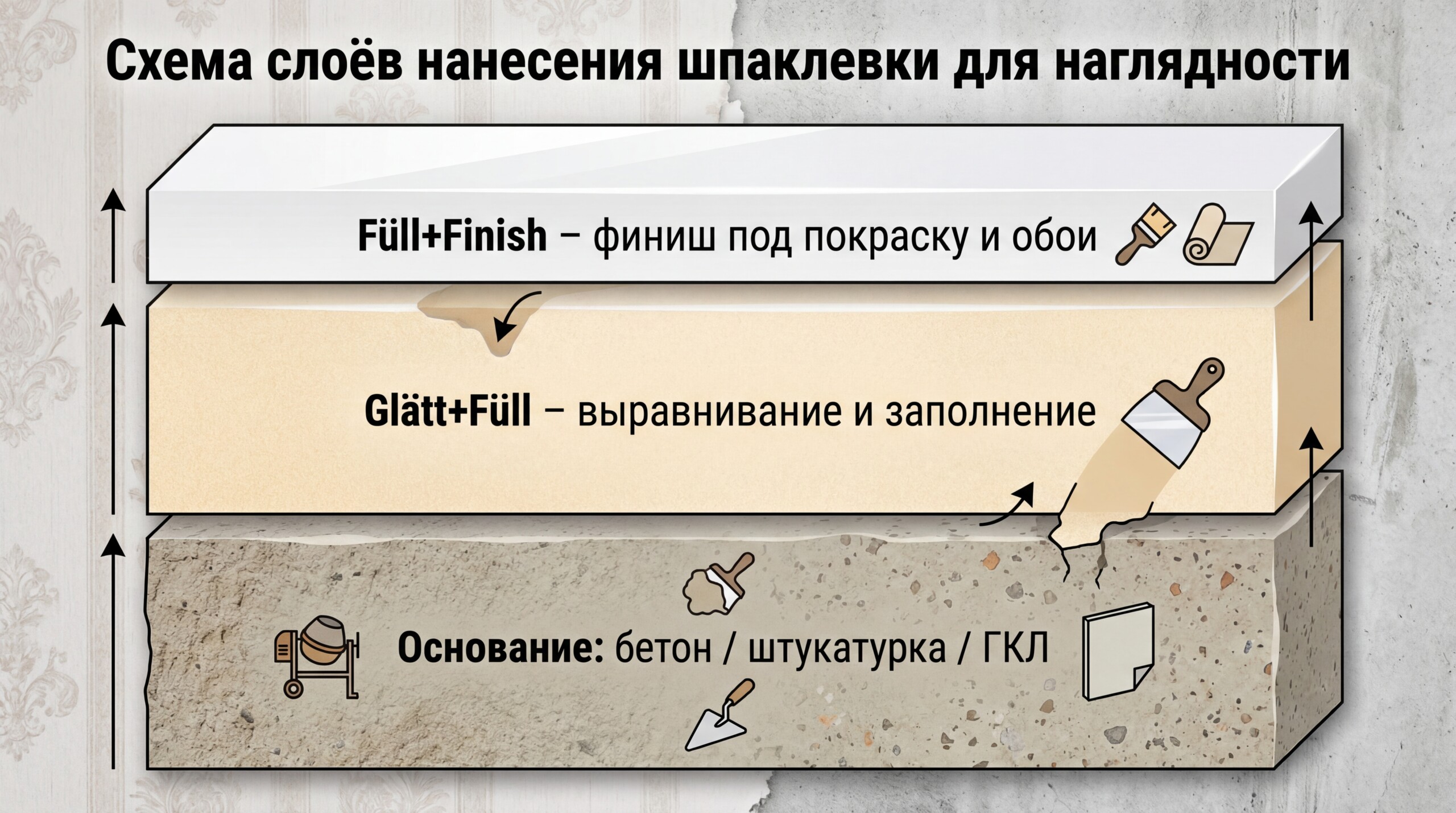 | Толщина слоя | От тонкого финишного слоя до значительных толщин при выравнивании | Толстые и средние слои, удобна для заполнения глубоких неровностей и трещин |