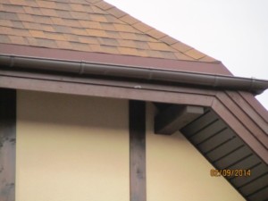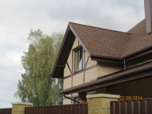 Выполнили монтаж «кровли под ключ»: монтаж стропильной системы 50*200, пароизоляции, утепления 200 мм утеплителем Парок, сплошное основание плита OSB-3. Кровельный материал: битумная черепица IKO Кембридж коричневый. Подшивка свесов выполнена софитом VOX. Установлена пластиковая водосточная система коричневого цвета. Монтаж выполнен в 2013г.