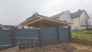 На объекте смонтирован навес на две машины с открытыми балками и сплошным основанием из имитации бруса. Из-за малого уклона кровли в качестве покрытия кровли был выбран наплавляемый рулонный материал. Секции забора выполнены из горизонтальных жалюзи. Работы проводились в 2016 г. бригадой из трех человек. Объект сдан за 4 дня.