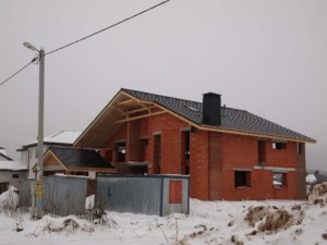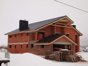 Кровля на жилом здании делалась с нуля. В качестве кровельного покрытия заказчик выбрал плоскую цементно-песчаная черепицу Braas, модель Тевива Cisar. Сложность монтажа черепицы заключается в расчете шага обрешетки и количества черепиц в ряду. Обшивку вентшахт произвели профнастилом с8 черного цвета. Работы проводились 2017г., на объекте работали 4 человека. Сроки выполнения кровельных работ – 1,5 мес.