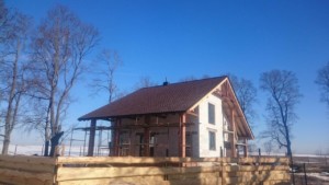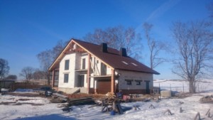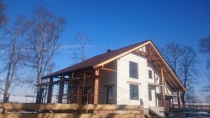 Выполнили монтаж двускатной кровли 302 кв.м. После монтажа стропильной системы стало понятно, что балки нужно оставлять открытыми. В качестве сплошного основания на свесах кровли использовали имитацию бруса. Утепление мансардного этажа выполнено утеплителем Парок, толщиной 250 мм. Покрытие выбрано – керамическая черепица Braas, коллекция Rubin 13V коричневого цвета. Водосточная система — металлическая, подобрана под цвет кровли, немецкого производителя Zambelli. Вентшахты планируется обшить композитным материалом, напоминающим сланец.