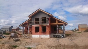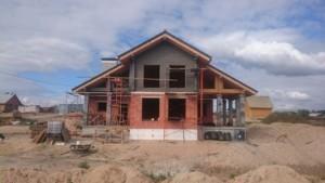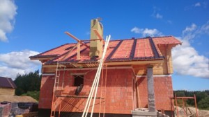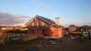 Двухэтажный жилой дом возводили «с нуля». Из-за сложных грунтов проектировщиками было принято решение о необходимости применения свайно-ростверкого фундамента. Стены сложены из керамических блоков Винербергер на теплый шов. Второй этаж – деревянный из бруса. Брус окрашен в серый цвет. Кровля – керамическая черепица. Так как второй этаж деревянный, приняли решение подшить свесы строганой доской с зазором. Утеплитель кровли — Парок. Толщина утепления 250 мм. Год постройки 2016. Строительные работы были выполнены бригадой из 6 специалистов за 7 месяцев.