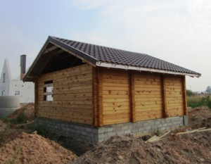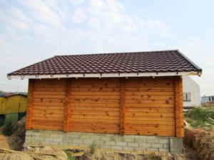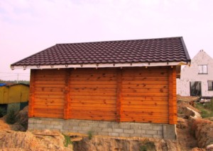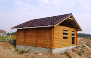 Кровля деревянной бани была покрыта модульной металлочерепицей BudMat Венеция коричневого цвета. Работы проводились в 2016 г.