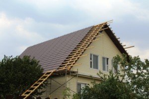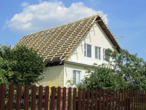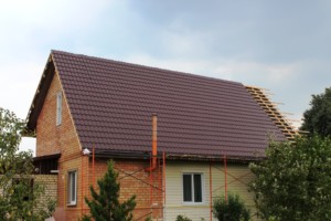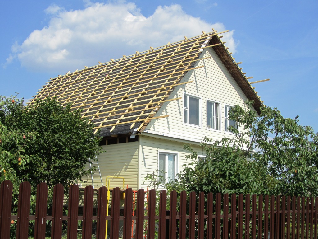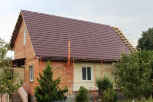 Здесь были выполнены работы по замене старой кровли из шифера на новую металлочерепицу с типом волны Монтеррей. Параллельно выполнили выравнивание кровли и подшивку свесов софитом VOX. Работы выполнены в 2015 г.