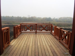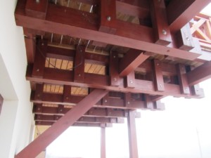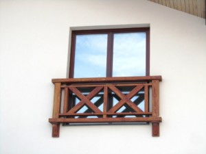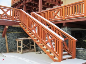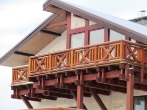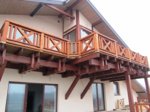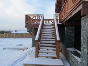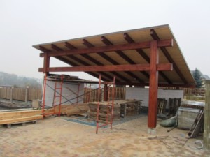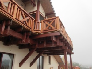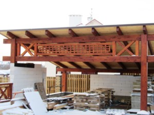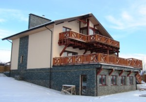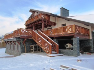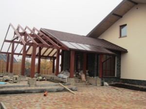 К существующему зданию по проекту были пристроена с главного входа входная группа в виде навеса и тамбура. По задумке архитектора все балки и стропила открыты. Сплошной настил кровли выполнен из строганой доски. Покрытие – битумная черепица IKO ArmourShield коричневого цвета. С задней стороны здания пристроен открытый балкон в этом же стиле с открытыми балками. В качестве настила использовалась террасная доска из лиственницы. Работы были выполнены в 2012 г.