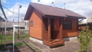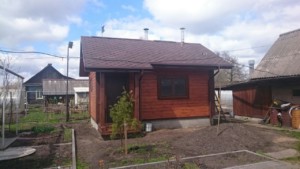 Кровля на бане покрыта гибкой черепицей IKO Армошилд коричневого цвета. Основание – OSB-3. Выбрали водосточную систему металлическую, т.к. она имеет меньшие линейные расширения, не выгорает на солнце и срок службы составляет 30 лет. Подшивка свесов выполнена строганой доской. Кровельные работы выполнялись 2016г. бригадой из 4 монтажников за 14 дней.